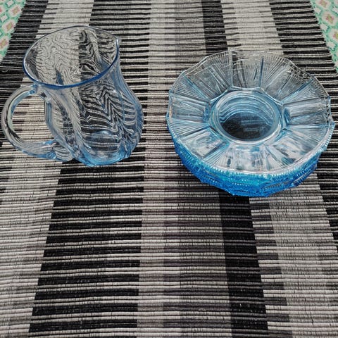 Antika sherry-glas med tillhörande kanna i tunt skirt blått glas. Inga repor eller skador! 200 kr Finns centralt i Örnsköldsvik