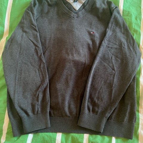 Snygg tröja från Lacoste med breda horisontella ränder i grått, svart och lila.