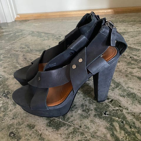 klackskor i storlek 38. Svarta skor med flera remmar över foten dekorerade med metallnitar. Öppen tå och klack i trälook. Dragkedja bak på hälen för enkel av- och påtagning. Passar exempelvis till vardag och fest där klackskor önskas.