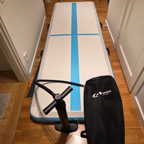 Nordic Design airtrack i rosa och vitt. Uppblåsbar gymnastikmatta med medföljande elektrisk pump enligt bild. Lämplig för gymnastik, träning, lek och övningar inomhus eller utomhus på plant underlag.