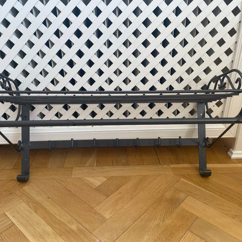 Svartlackerad hatthylla med perforerad hyllplan.