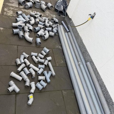 Plast rördelar bestående av flera muffar och övergångar i grå färg. Blandade dimensioner och former, både raka och vinklade delar. Lämpliga som kopplingar och övergångar i olika rörsystem för exempelvis avlopp eller dränering. Säljes som parti enligt bilder.