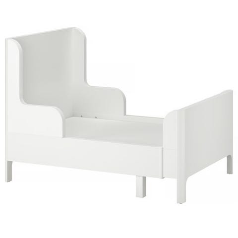 IKEA utdragbar juniorsäng i vit färg. Sängen kan förlängas i tre längder enligt behov och passar växande barn. Höga gavlar runt huvud- och fotända ger en ombonad känsla och kan fungera som stöd för kuddar. Till sängen hör en vit utdragbar madrass i tre delar som följer sängens längdinställningar. Lämplig som barnsäng/juniorsäng i barnrum.