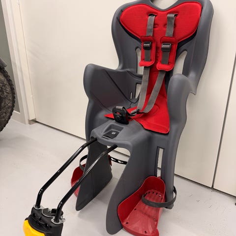 Stabil stol av formgjuten plast. Högt ryggstöd som är ergonomiskt utformat så att det finns plats för huvudet när barnet bär hjälm. Bekväm sittdyna med spänne som kan öppnas med en hand. Justerbar bältesinfästning och justerbara fotband. Fotstödet är lätt att justera och kan höjas/sänkas hela 15 cm.