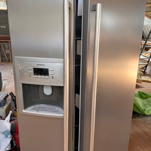 IKEA side-by-side kyl och frys i rostfritt stål. Skåpen har vertikal dörröppning med handtag framtill. Frysdelen har flera genomskinliga lådor för överskådlig förvaring av frysta varor. Kyl- och frysskåpen är fristående och anpassade för placering bredvid varandra för att bilda en side-by-side-lösning i köket. En låda fatts i frys skåpet.