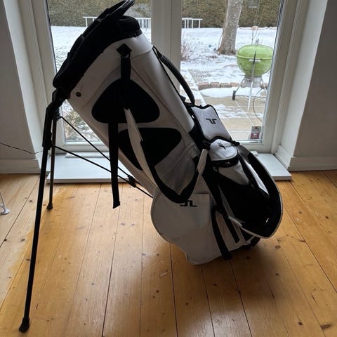 J.Lindeberg golfbag standbag i svart och vitt. Väskan har inbyggt stöd med två utfällbara ben som gör att den kan stå stabilt på marken. Bärremmarna är vadderade för att underlätta transport på golfbanan. Flera fack ger plats för klubbor, bollar och tillbehör. I bra skick.