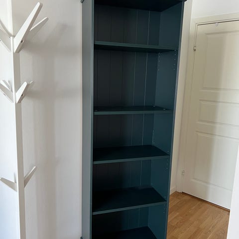 Blå Englesson, med 3 hyllor samt en låda.