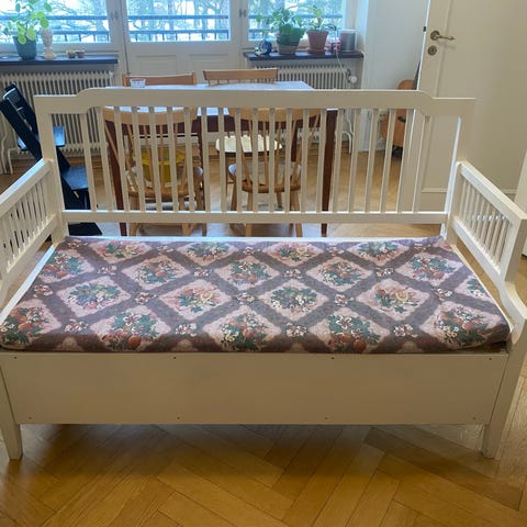 Kökssoffa i brunlackerat trä. Hemmasnickrad av förra ägaren. Sitsen går att fälla upp för förvaring. Generös sittyta! Innerlängd ca 55x170cm. Yttre mått ett par cm till.