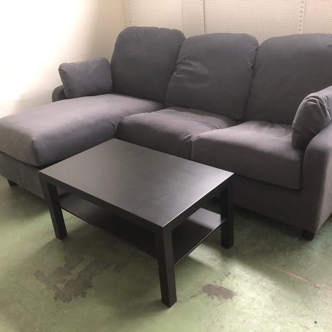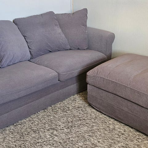 2 sits Soffa med fotpall i tyg i mycket bra skick. Måtten: 180x100x85cm sitthöjd 48cm fotpall 95x75cm . Pris: 1600kr eller pris efter gemensam överenskommelse säljes för Hörby FF loppis och det går bra att komma och titta på soffan.