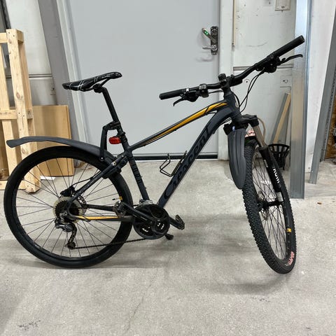 Utrustad med Shimano-växlar, 3 växlar på vänster sida och 9 växlar på höger sida (27 växlar totalt). Cykeln har hydrauliska bromsar som ger bra och säker bromskraft.