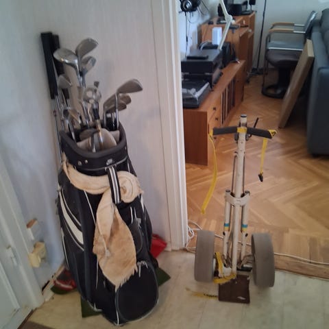Golfvagnen är en trehjulig manuell vagn som kan fällas ihop för enklare transport och förvaring. Bagen är anpassad för användning tillsammans med vagnen och fästs ovanpå denna.