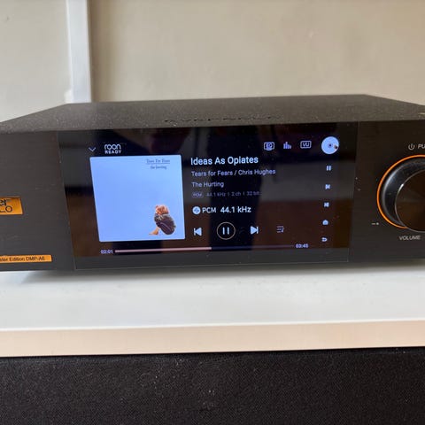 EverSolo DMP-A6 nätverksspelare i svart utförande. Enheten har stor färgskärm på fronten med grafiskt gränssnitt för styrning av musikuppspelning och inställningar. Volymratt och knappar sitter på frontpanelen. Produkten är avsedd för uppspelning av digital musik via nätverk och kan anslutas till befintligt ljudsystem för streaming och filuppspelning.