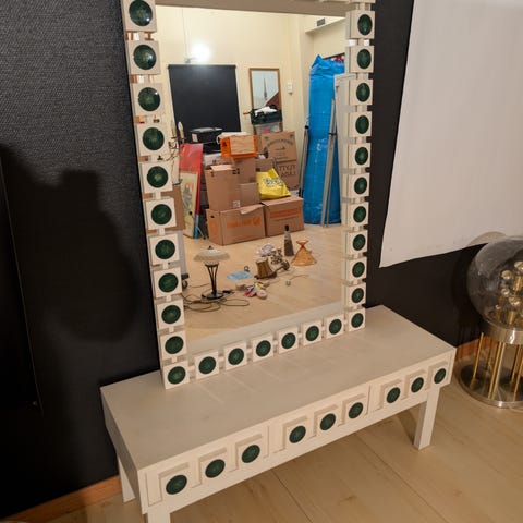 Antik tre delad spegel från 1900 talet med träram i alm. Spegeln består av tre delar som kan vikas ut eller fällas ihop, vilket gör den lämplig som bords- eller väggspegel. Baksidan har upphängningsanordning med rep och etikett från tillverkare. Passar exempelvis i sovrum, hall eller på sminkbord.
