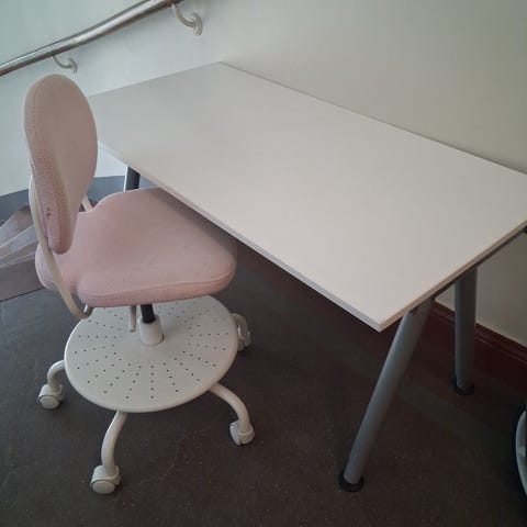 Skrivbord + kontorsstol till salu i bra skick. Vit färg. Skrivbordet har några repor på ytan inte så synliga. I lådan finns fläckar går säkert att måla över om man vill eller täcka över med nåt. Annars är det i bra skick.