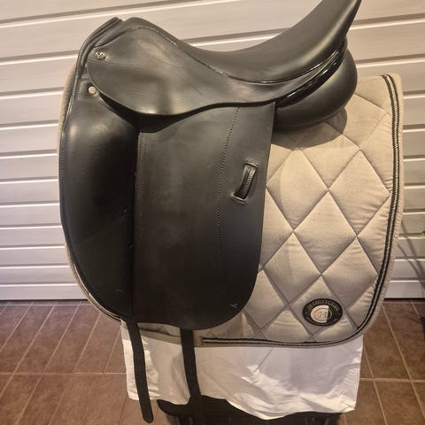 17" 3+, i bra beg skick. Passar många ryggar, väldigt skön sadel av kalvskinn och latexstoppning. Ger ryttaren en bra sits. Enkelkåpad med långa knästöd. Är lite solblekt på bakvalv därav pris men inget som påverkar funktionen. Pris inkl frakt och köp via blocket