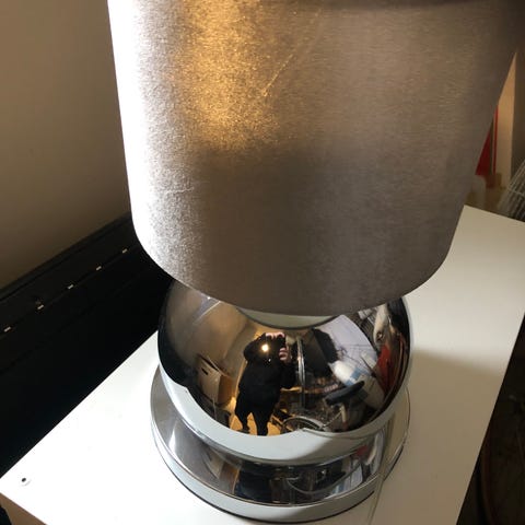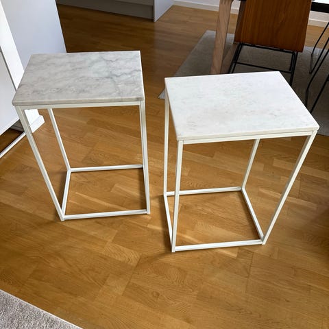 Säljer ett runt sidebord med glasskiva och en praktisk hylla i valnötsfaner under. Passar bra bredvid soffan eller fåtöljen, men fungerar också fint som sängbord.