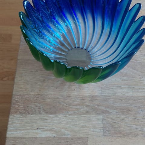 IKEA glasskål i blått och grönt glas. Skålen har vågformad kant och står på en dekorativ fot i klart/grönt glas. Passar som fruktskål, godisskål eller som dekoration på bord eller hylla.