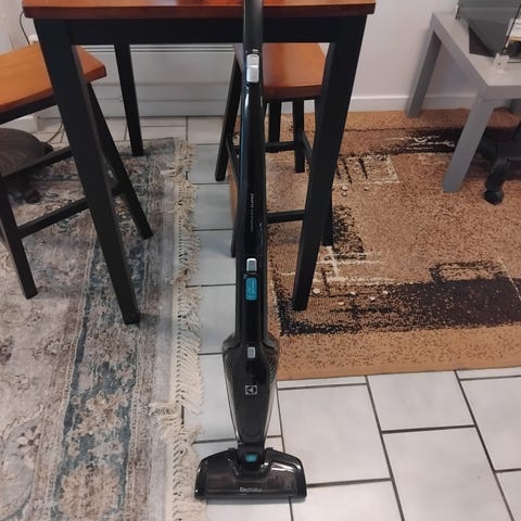 Electrolux skaftdammsugare. Sladdlös modell med integrerat skaft och golvmunstycke. Passar för dammsugning av hårda golv och mattor i hemmet. Färg i svart och silver. Exakta modellbeteckningar och tekniska specifikationer framgår inte av bilderna.