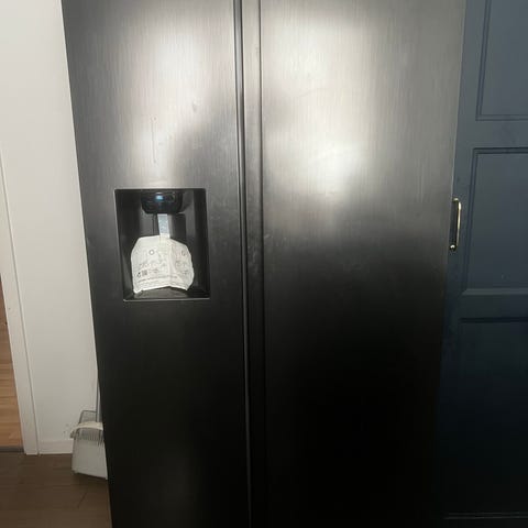 Stort, svart kyl & frys med is och vatten. Storlek: 177 cm höjd, 75 cm djup och 90 cm bred.