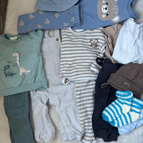 Klädpaket i storlek 68. Flerfärgad uppsättning med flera plagg, bland annat långärmade tröjor och byxor i olika färger och mönster.