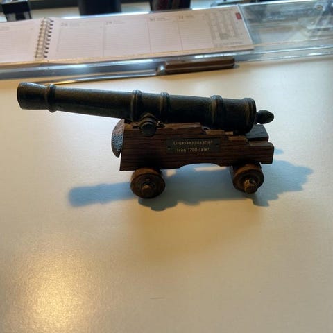 Dekorativa modellkanoner i metall med mässingsfärgade kanonrör och mörka lavetter. Passar som inredningsdetalj, prydnad eller samlarobjekt. Utformade med hjul och klassiska detaljer som på äldre kanoner. Levereras som två separata kanoner enligt bilderna.
