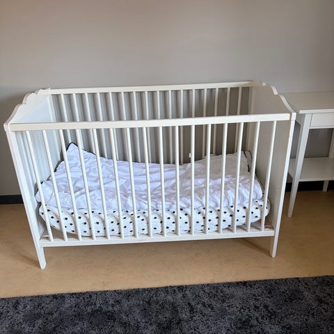 IKEA GULLIVER spjälsäng i vit färg. Mått enligt produktbild: cirka 60x120 cm liggyta. Klassisk spjälsäng med ribbor runtom och högt huvud- och fotgavel. Passar standardmadrass för spjälsäng 60x120 cm. Lämplig för spädbarn och småbarn som behöver sova i trygg och avgränsad säng. Sängen är avsedd för inomhusbruk i barnrum eller sovrum.