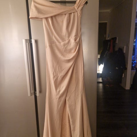 Festklänning i lila färg i storlek 38. Klänningen är lång och har en axelbandslös/one shoulder-design med draperad överdel och rak, fallande kjol. Passar för fest och andra högtidliga tillfällen. Dragkedjan kan kärva lite men ingenting som stör designen.