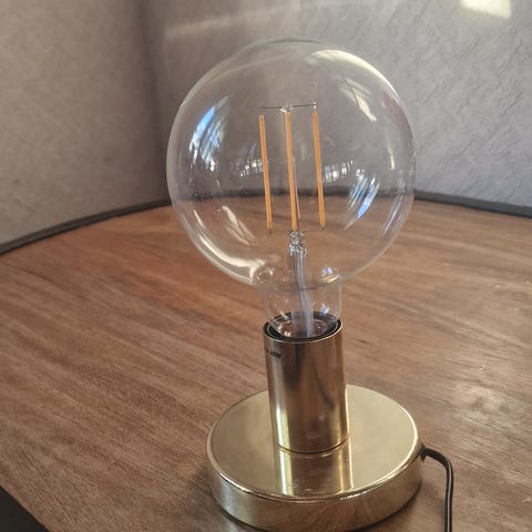 Mässingsfärgad bordslampa i mycket bra skick. Ca 44 cm hög. Inkl. fungerande ljuskälla.