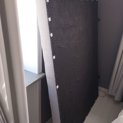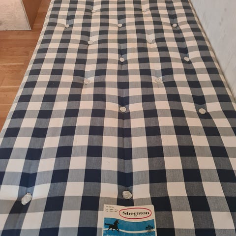 Hästens säng med klassiskt blåvitt rutigt tyg.