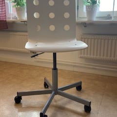 IKEA kontorsstol på hjul i vit färg. Stolen har sits och rygg i perforerad plast med rundade hål och ett underrede i metall med kryssfot och fyra hjul. Höjden är justerbar med gaspelare. Passar som skrivbordsstol i hemmakontor, barnrum eller arbetsplats.
