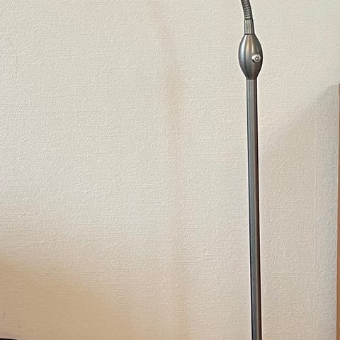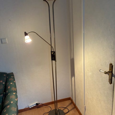 Golvlampa i metall i brun brons nyans. Lampan har en smal, rak stomme med en justerbar läsarm upptill. På stativet finns två vred för att slå på och av lampan. Passar som belysning i vardagsrum, sovrum eller läshörna. Dimbar. Båda ljuskällor fungerar och följer med.