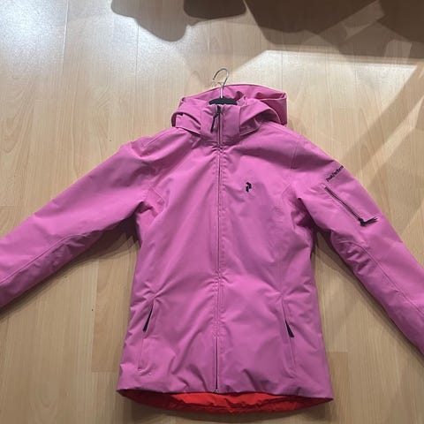 Peak Performance jacka för barn i röd och rosa färg. Modellen har huva och hel dragkedja framtill. Jackan är midjelång med långa ärmar. Passar för vardagsbruk och utomhusaktiviteter samt skidåkning. Storlek enligt etikett: 150.