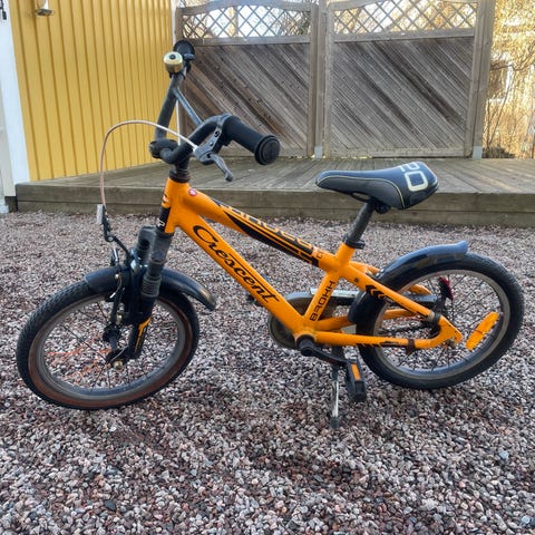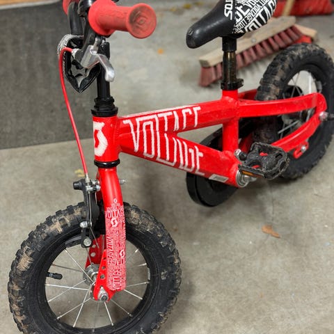 Kayoba Surge barncykel med 12" hjul i röd färg. Cykeln har ram med BMX-inspirerad design, fotpedaler och handtag med skydd. Utrustad med stödhjul bak för extra stabilitet vid inlärning. Passar mindre barn som ska lära sig cykla på en kompakt cykel med små hjul.