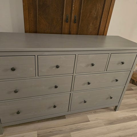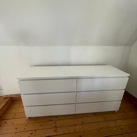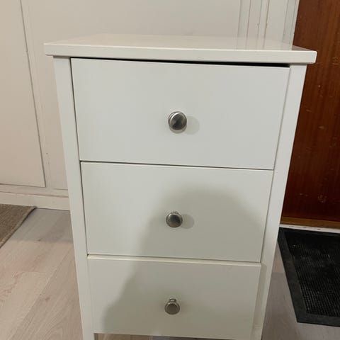 Sängbyrå Hemnes med två lådor i vitbets. Tecken på användning finns ovanpå byrån, annars är den i jättefint skick. Se sista bilden för mått.
