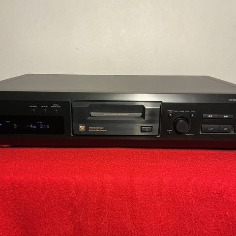 Fristående minidiscspelare för hemmabio eller stereoanläggning. På fronten finns display, inspelnings- och uppspelningsknappar, volym-/navigationsratt samt fack för minidisc. Enheten har analoga ljudanslutningar på baksidan (RCA in/ut) för inkoppling till förstärkare eller receiver.