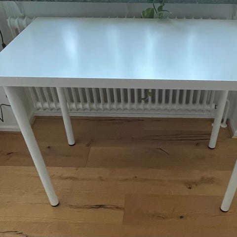 Vitt rektangulärt skrivbord. Bordet har raka ben och en slät bordsskiva. Passar som arbetsbord eller studiebord i hemmet eller på kontor. Materialet ser ut att vara en lackerad skiva på enkla ben i samma färg. Mått och exakt material är inte angivna.