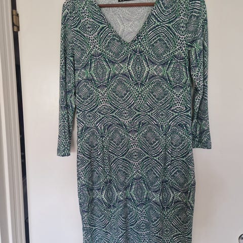 Klänning med långa ärmar och v-ringning. Klänningen har ett mönster i blått, svart och vitt.