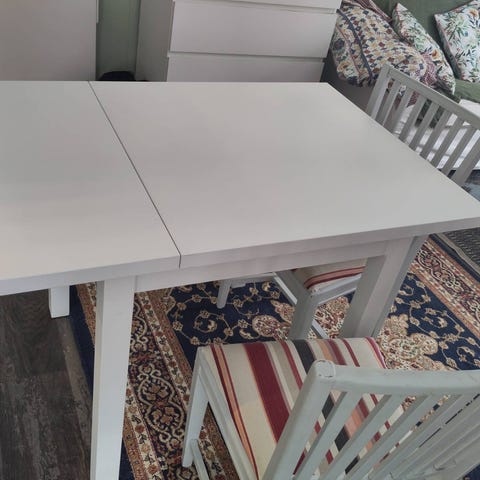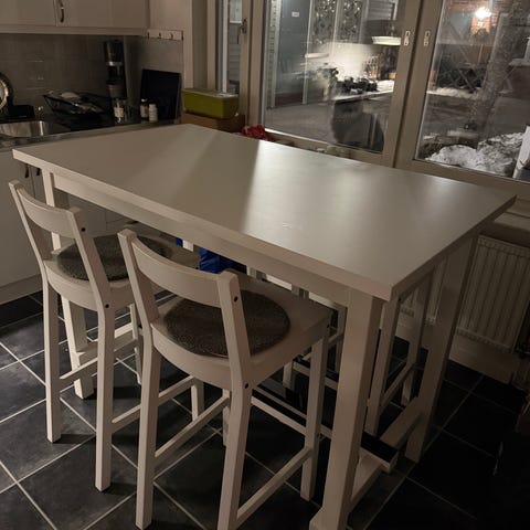 IKEA matgrupp bestående av ett fyrkantigt bord i mörkbrunt träutseende och fyra stolar med mörkbruna ben och vita sitsar/överdrag. Bordsskivan har synliga märken och repor enligt bilder. Stolarna är vadderade med ryggstöd och sits i tyg. Passar som matgrupp i kök eller mindre matplats. Storlek på bordet uppskattas till plats för fyra personer runt bordet.