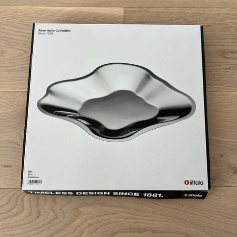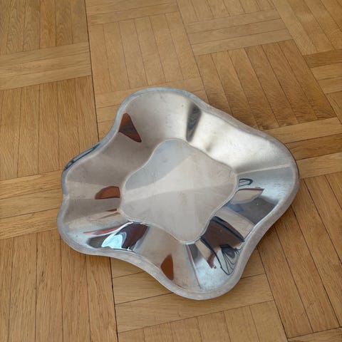 Iittala Alvar Aalto skål i rostfritt stål. Skålen har den karakteristiska organiska Aalto-formen med mjukt vågiga kanter. Passar som fruktfat, serveringsskål eller dekoration i hemmet. Färgen är metalliskt silver från det rostfria stålet.