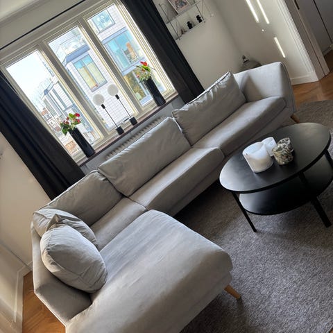 Madison 2-sits soffa med schäslong vänster i variant lux med tyget Moon gray. Ben i vitbetsad ek. Soffan är ca. 2 år gammal och i väldigt bra skick. Står i ett djur- och rökfritt hem.