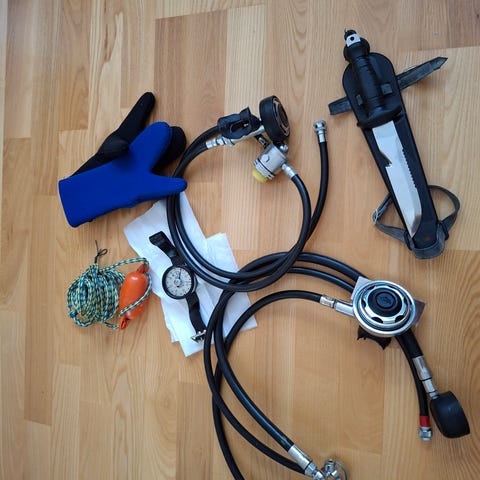 Slangarna har förvarats svalt och mörkt i förråd. Det föremskommer oxidation/ärg på metallkopplingarna (se bilder). Som med all dykutrustning rekommenderas en översyn och trycktest före användning.