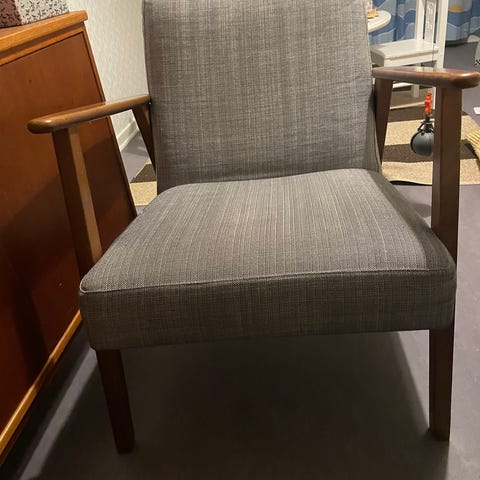 Fåtölj från Ikea, Ekenäset. Grått tyg. Betsat brunt trä. Finns ej att köpa i butik längre.