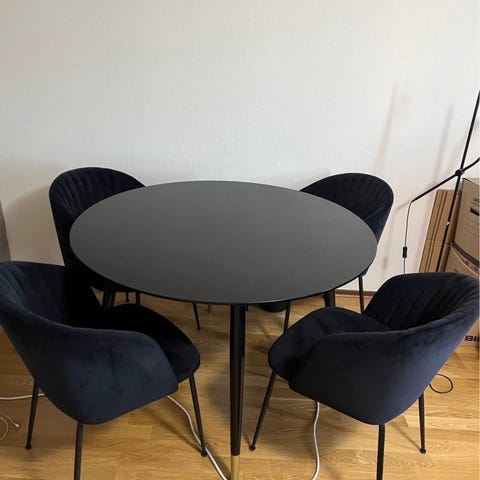Svart matbord och fyra svarta stolar med gulddetaljer säljes. Mått enligt bilder.