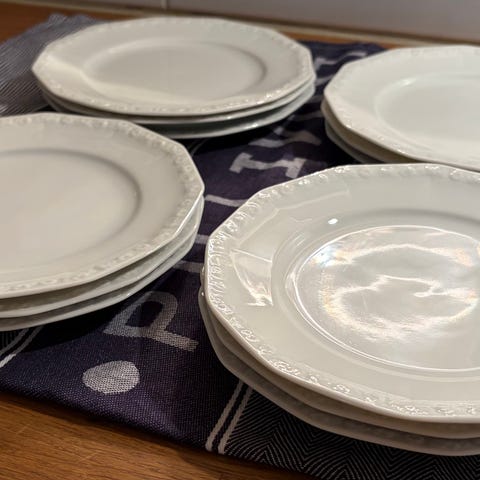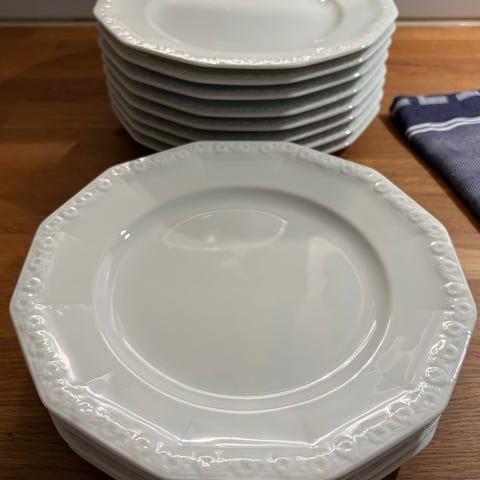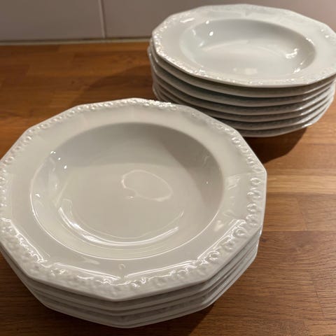 Rosenthal porslinservis med blommönster. Servisen består av 12tallrikar, 2 små uppläggningsfat i olika former, en såsskål och ett fyrkantigt serveringsfat. Delarna är i vitt porslin med dekor i ljusa pastellfärger och blommotiv. Passar som mat- och serveringsporslin i kök eller matsal.