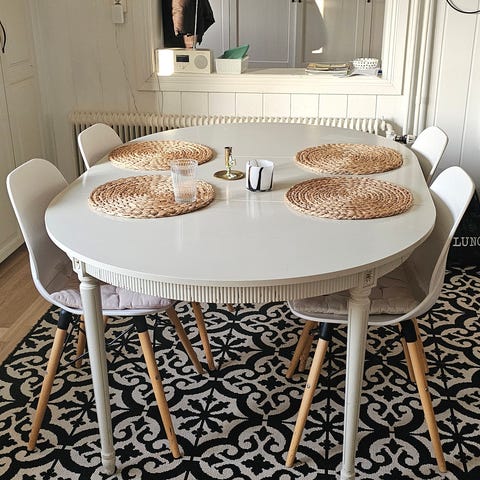 Lite smutsiga stolar och bordsskivan har lite spår av användning. Snyggt och gjort av återanvänt upp till 200år gammalt virke. Riktigt stadig möbel och ingen fanerskräp.
