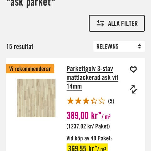 Exakta mått, nyanser och antal kvadratmeter framgår av respektive paketetikett. Samtliga golv går att köpa i butik om man behöver komplettera med mer.