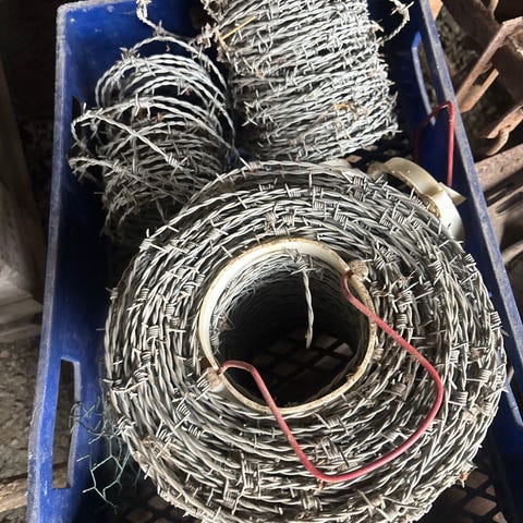 Ståltrådsstängsel i rulle av galvaniserat metallnät. Nätet är fyrkantigt maskat och lämpar sig för inhägnad av trädgård, djurhage eller liknande avgränsningar. På bilderna syns även tillhörande fästdetaljer som kan användas vid montering av stängslet. Den stora rullen är ca 20 m och 150 cm hög. Den lilla är ca 5 meter lång och 100cm hög.