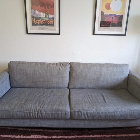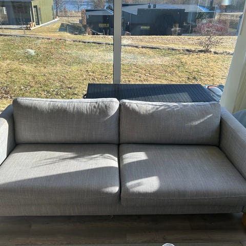 Fin, väl omhändertagen soffa i gråmelerat tyg. Avtagbar och tvättbar klädsel.