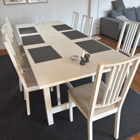 Vitt Ikea matbord Bjursta med två iläggsskivor, 175-260 cm långt. 6 st stolar IKEA Ingolf.