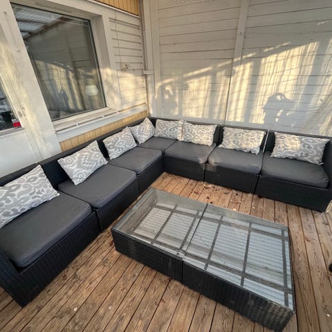 Hej! Jag har ett Loungeset från Jysk till salu. Det är Jutlandia Vonge med det snabbtorkande svarta tyget. Det är tillverkat av lackat aluminium, så det är helt underhållsfritt. Dynorna har jag förvarat både inhomhus och i dynlådor när de inte använts på sommartid, och under vintern har de förvarats inomhus. Skicket är bra och säljes enbart pga av flytt där de inte fick plats i den nya bostaden. Det är ett väldigt bekvämt loungeset som kommer att ge er många sköna stunder i solen.